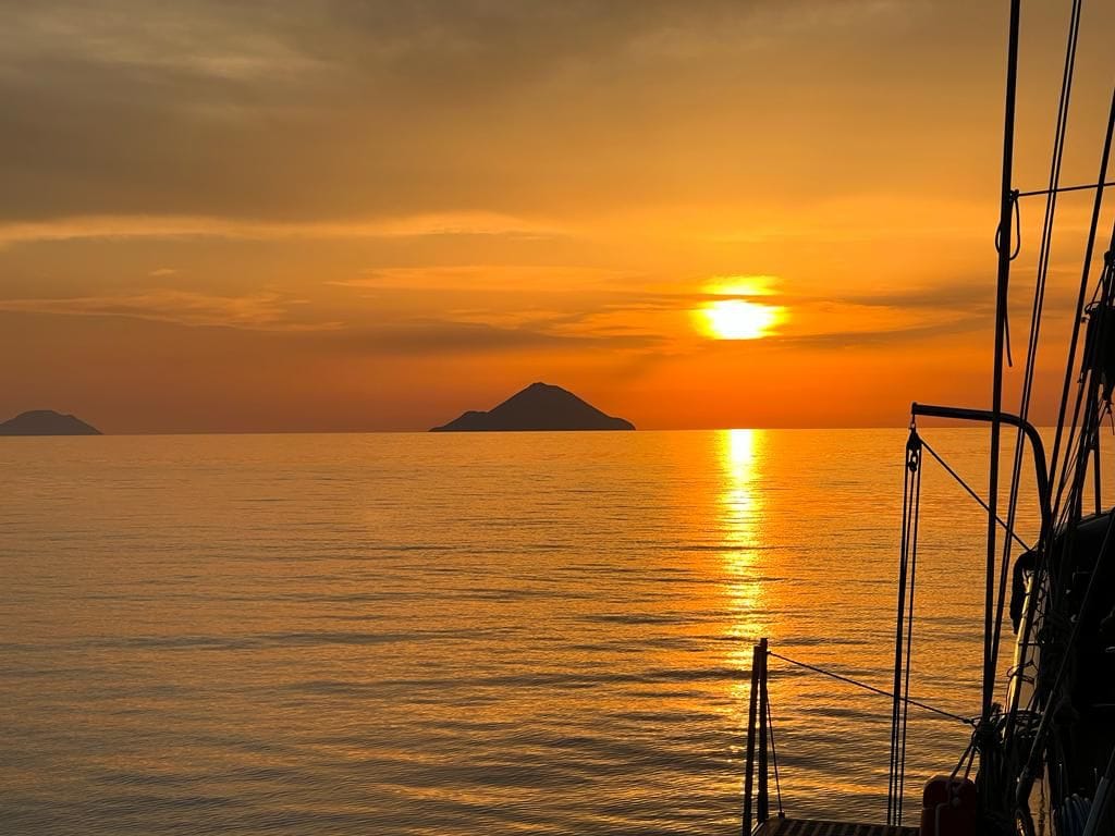 Gli aperitivi al tramonto a bordo del Caicco Almaram rappresentano uno dei momenti più suggestivi da vivere nelle Isole Eolie. Navigare mentre il sole si tuffa nel mare regala emozioni uniche e panorami indimenticabili.